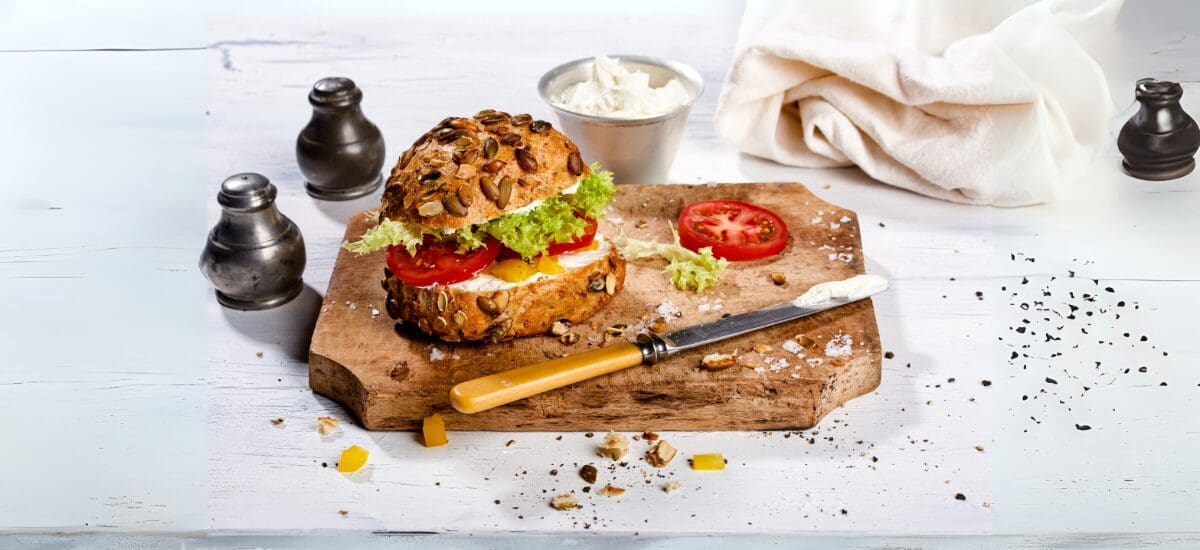 - Körnerbrötchen aufschneiden und beide Hälften mit Kiri® bestreichen.