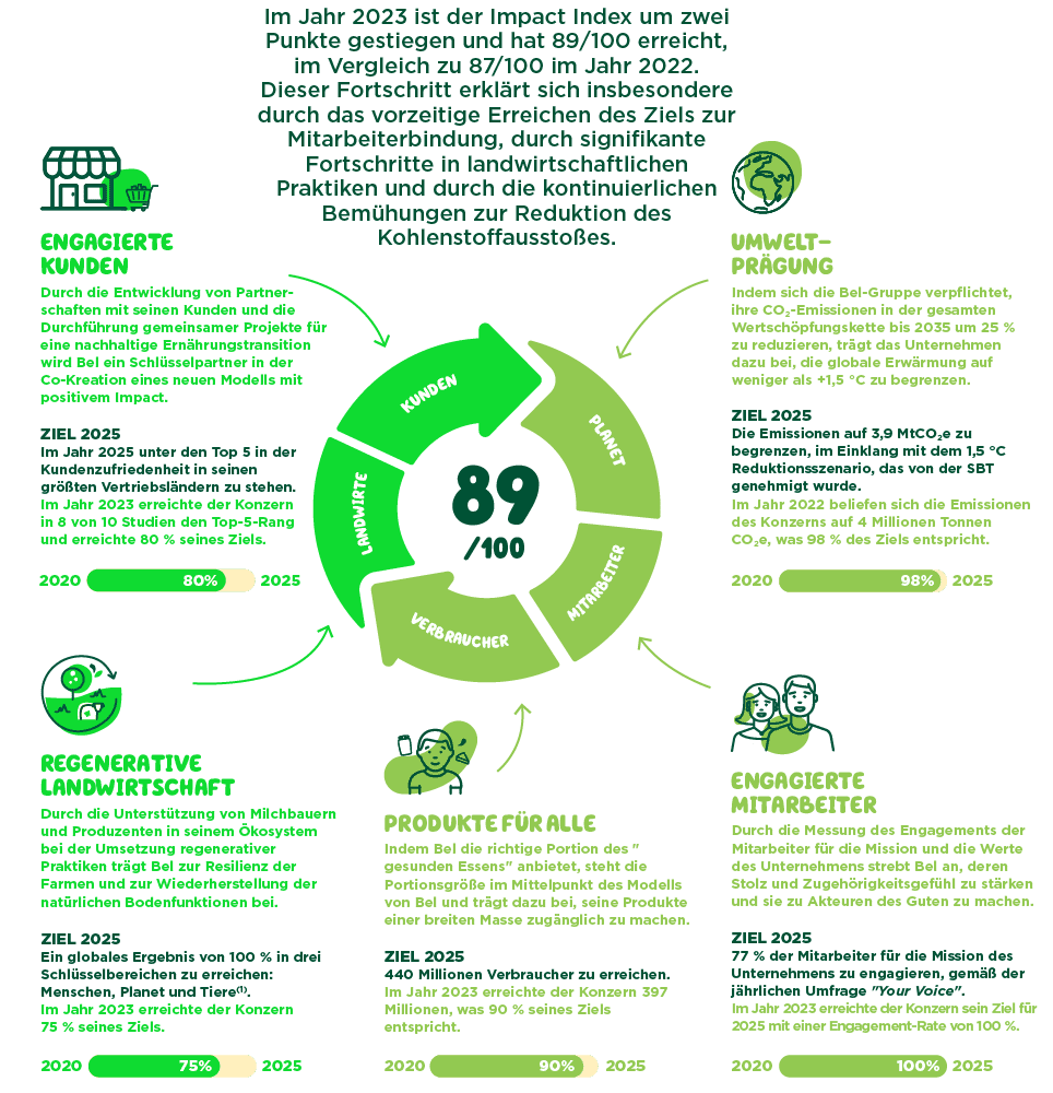 Der Positive Impact Index von Bel soll die Fähigkeit der Gruppe widerspiegeln, ihren Unternehmensauftrag zu erfüllen und ihr Ökosystem zu beeinflussen. Als Pionier in der Agrar- und Lebensmittelindustrie vermittelt dieser einzigartige Index das Engagement von Bel für seine wichtigsten Stakeholder und misst den Fortschritt der Gruppe anhand der gesetzten Ziele.