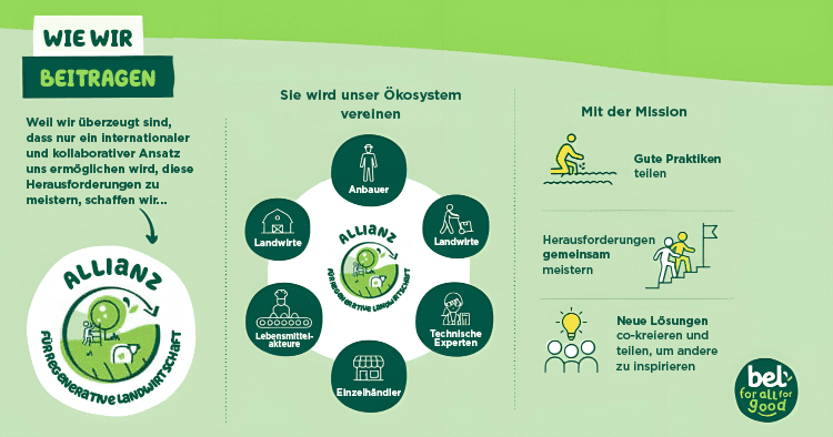 Bel ist der festen Überzeugung, dass es für eine tiefgreifende und dauerhafte Veränderung der landwirtschaftlichen Praktiken von entscheidender Bedeutung ist, die Unterstützung aller Akteure des Agrar- und Ernährungssektors, einschließlich Genossenschaften, Landwirten, Züchtern, Händlern, Experten, NROs und Verbrauchern, zu gewinnen. Aus diesem Grund hat Bel beschlossen, die Allianz für eine regenerative Landwirtschaft ins Leben zu rufen :